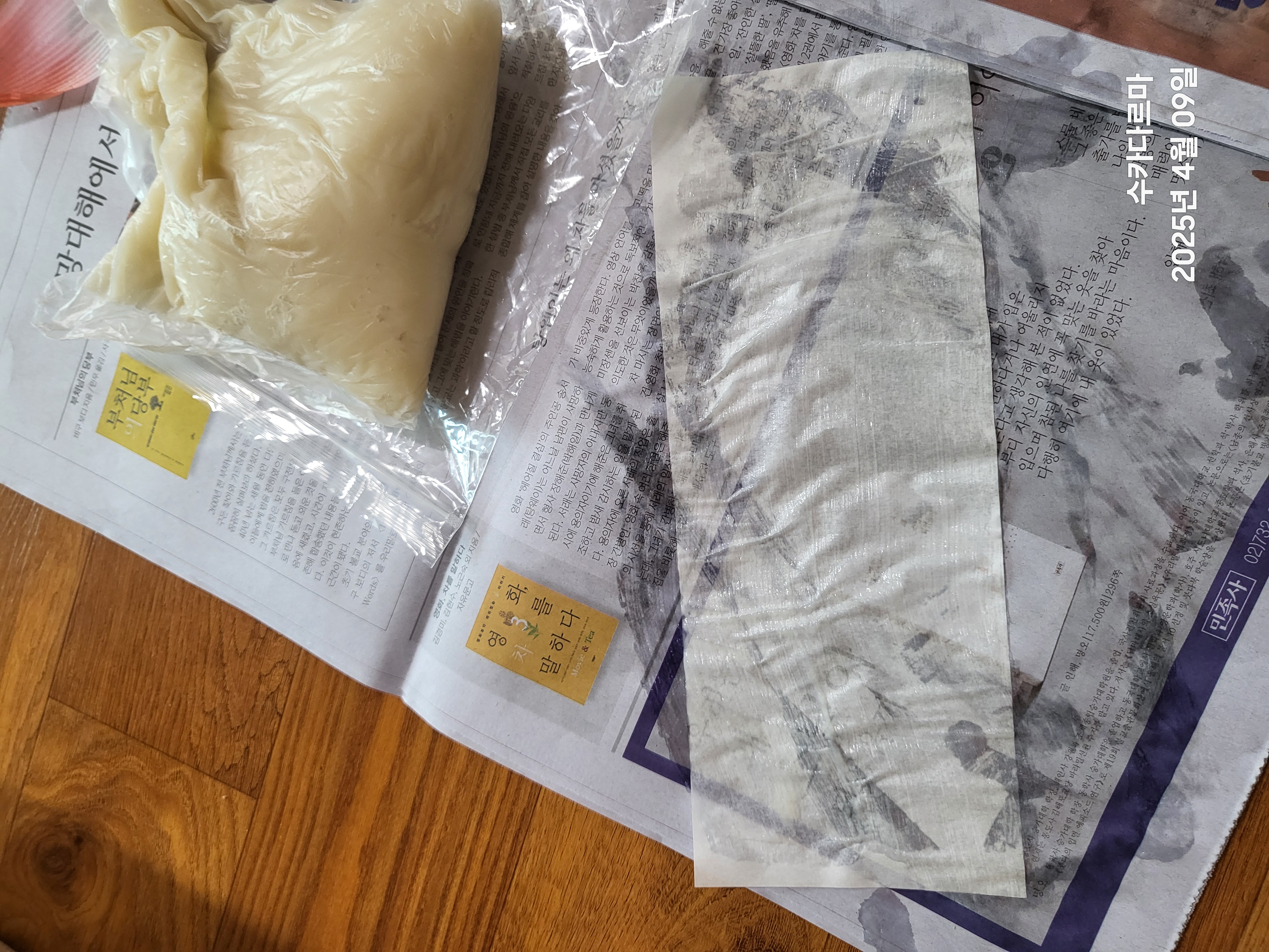 6. 연잎이 완성되고(1등당 연잎은 200개 안쪽이다. 버릴 분량까지 감안) 나면 말린 등살 종이 위에다가 위쪽에서부터 아래쪽으로 풀칠이 된 연잎을 붙이기 시작한다.