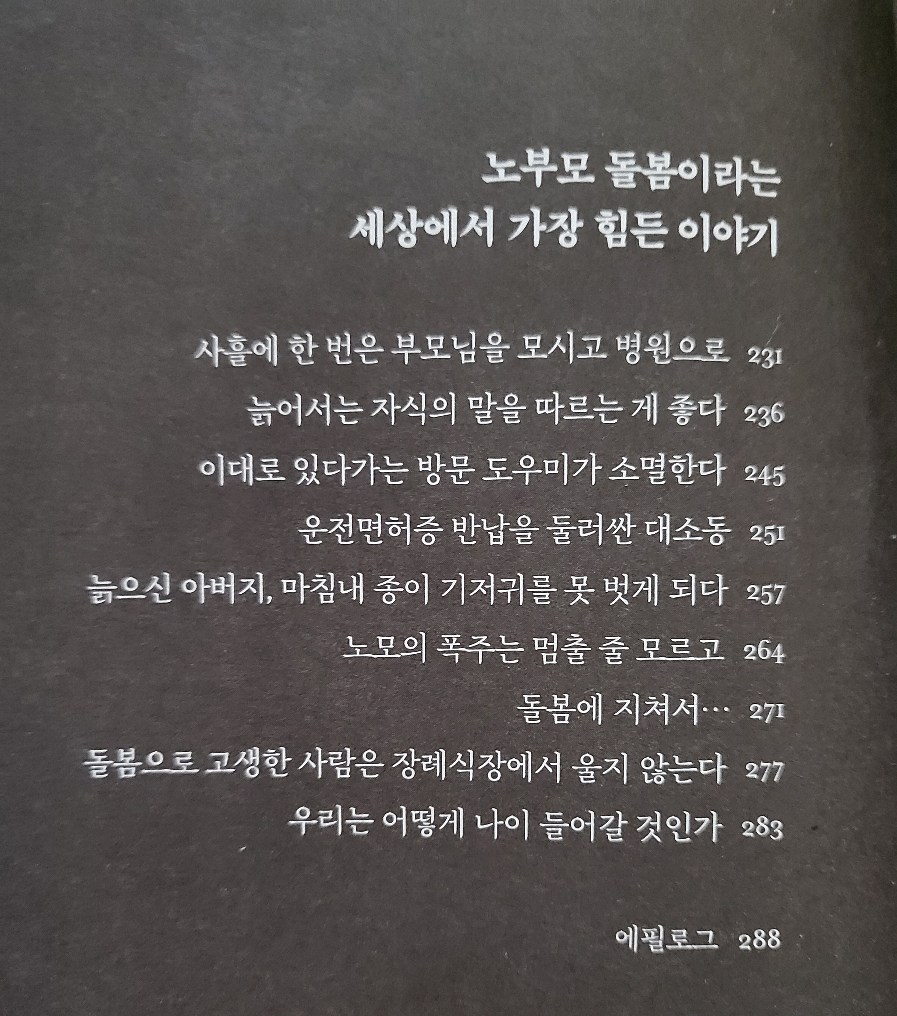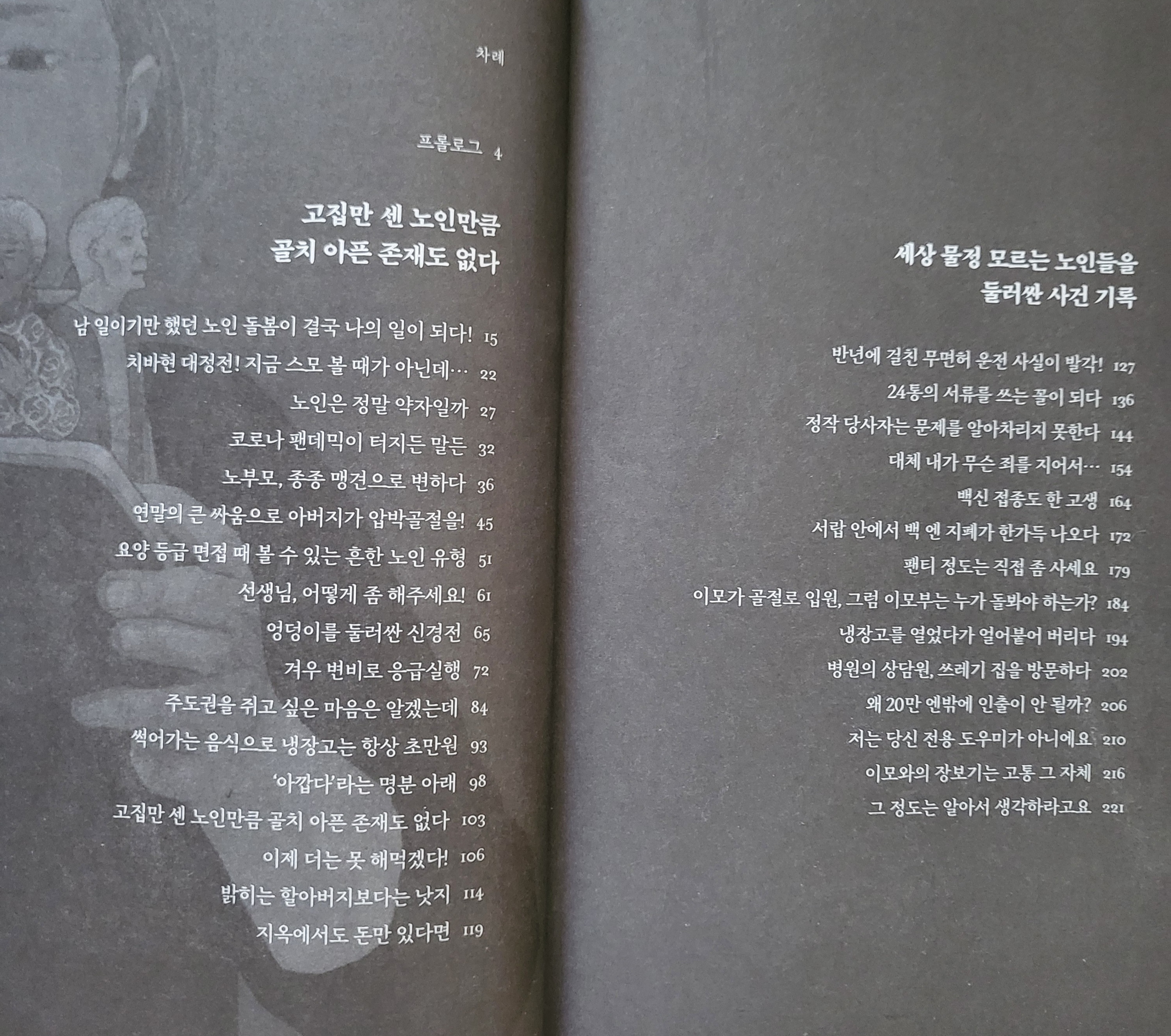 👉👉누구라도 생생한 정신으로 이 세상과 이별하고 싶겠지만 그만한 복을 타고 났다고는 감히 장담하지 못하겠다. 고집과 아집에 찬 지금의 모습에서 타인을 배려하고 너그럽게 살아가는 배움을 행한다면 작은 행운이라도 오지 않을까. 이 책은 나이 들어 가는 예비 노인들의 지침이 될 만 하다.