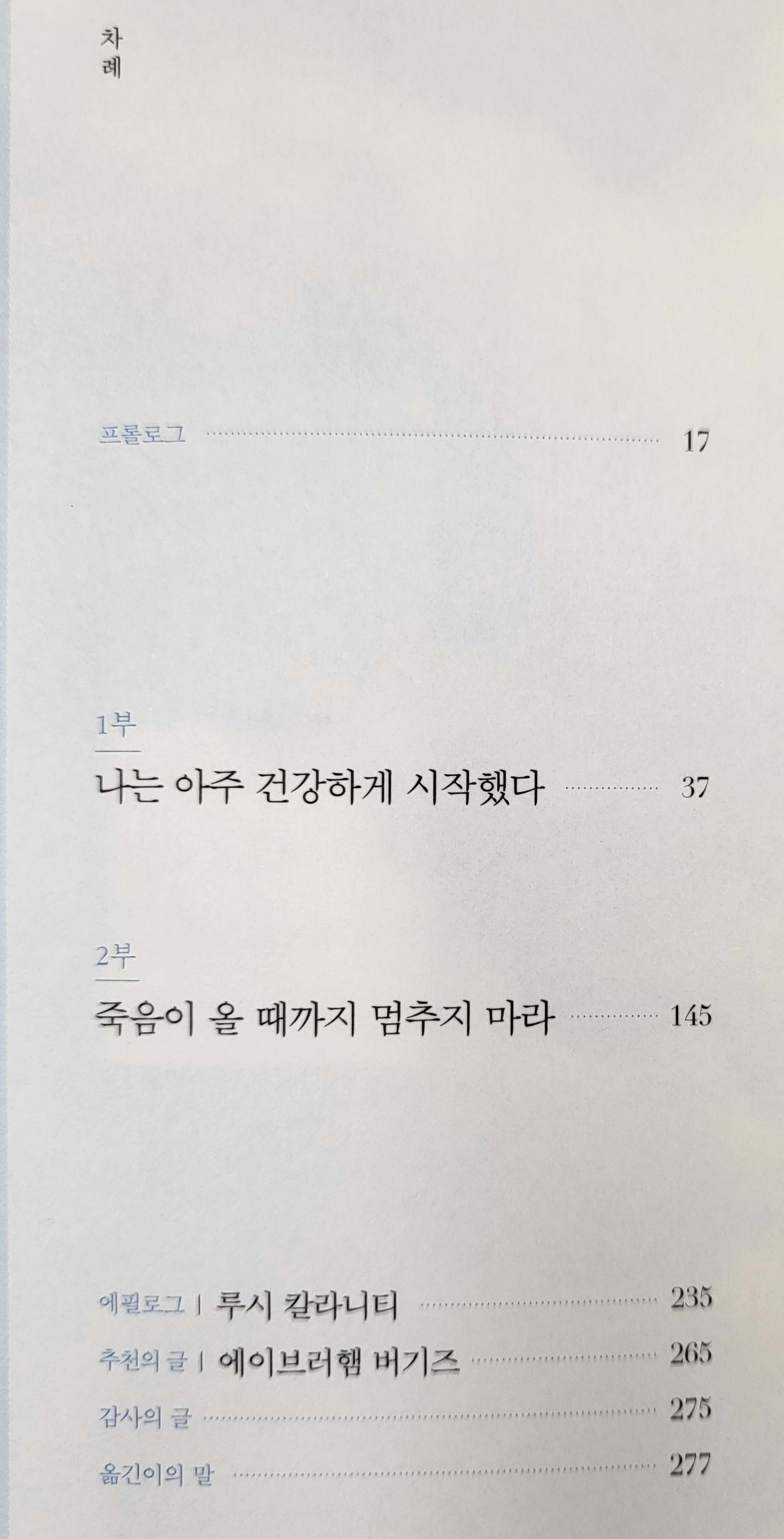 단은 명확했다. 무수한 종양이 폐를 덮고 있었다. 척추는 변형되었고 간엽 전체가 없어졌다. 암이 넓게 전이되어 있었다.나는 신경외과 레지던트로서 마지막 해를 보내는 중이었다. 그리고 지난 6년 동안 이런 정밀검사 결과를 수없이 검토했다. 혹시나 환자에게 도움이 될 방법이 있지 않을까 하는 마음에서. 하지만 이번 검사 결과는 이전과는 다른 의미를 지녔다. 그사진은 내 것이었다. 나는 수술복에 흰 가운을 걸치고 방사선실에 서 있는 것이 아니었다. 환자복을 입고 링거 대에 매인 채 간호사가 내 병실에 남겨둔 컴퓨터를 사용하고 있었다. 옆에는 내과의사인 아내 루시가 있었다. 나는 다시 검사 결과를 넘겨봤다.