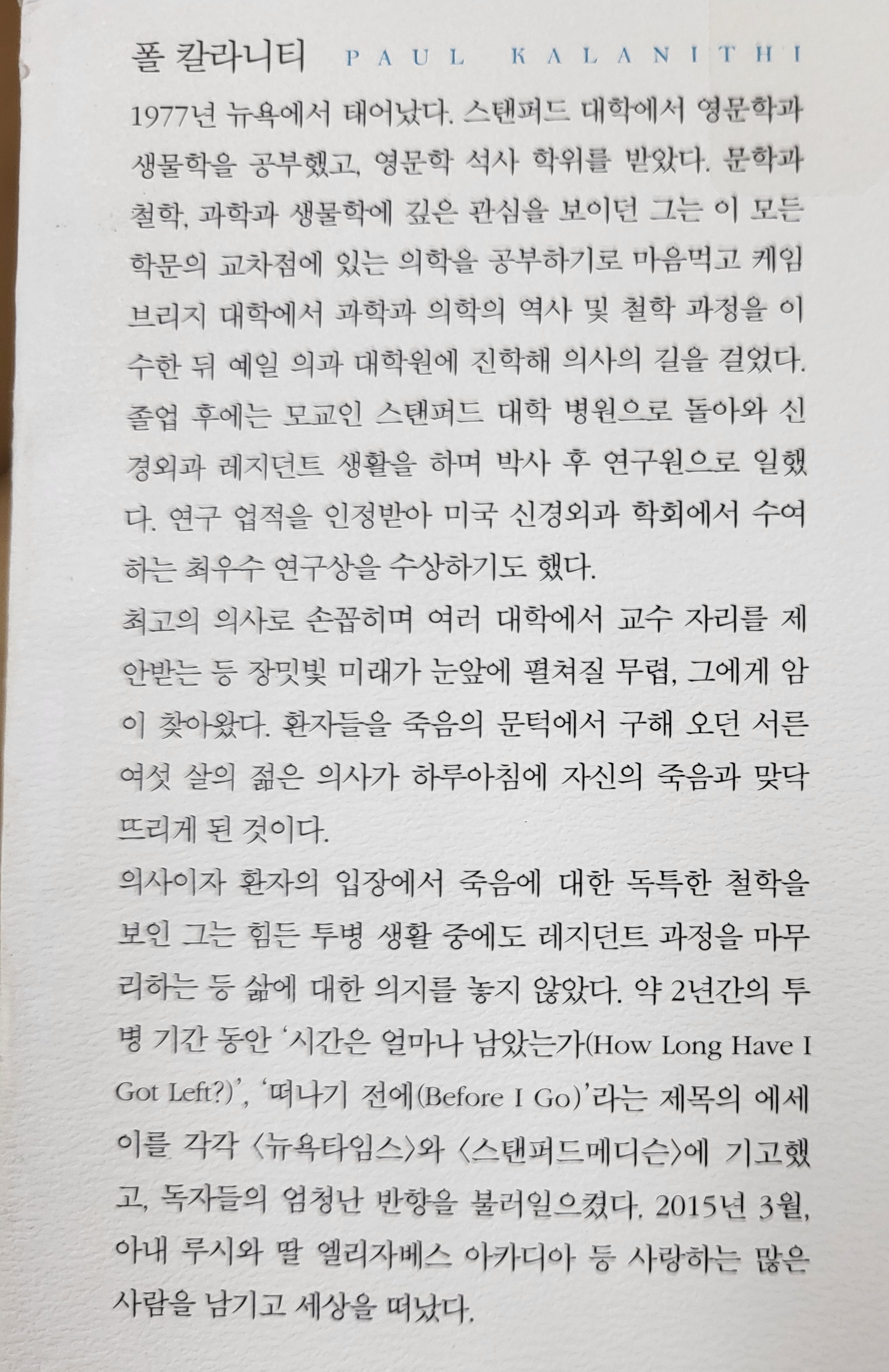 ♨️♨️♨️♨️ 35살의 폴 칼라니티는 스탠포드 의과대학원의 레지던트 과정을 수료를 목전에 둔 신경외과의 의사이다. 갑작스레 알게 된 폐암 징후를