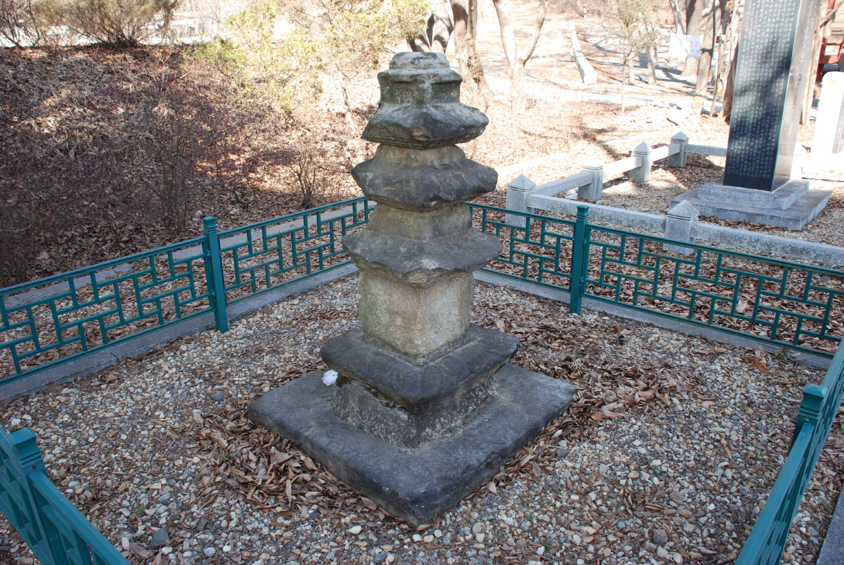 화강암으로 된 이 탑은 옥개석(屋蓋石) 부분이 많이 파괴되었다. 탑의 전체 높이는 130㎝에 불과하며 정사각형에 가까운 지대석 위에 최근 보수한 시멘트로 된 중대석(中臺石)과 그 위에 상대석(上臺石)과 삼층 탑신(塔身)이 올려져 있다. 옥개석과 탑신이 하나의 돌로 되어 있고 옥개석 아랫부분에는 3단의 옥개받침이 있으며 옥개석 추녀는 약간 반전(反轉)되었다. 상륜부(相輪部)는 둥근 모양의 노반(露盤)만 있으나 노반 중앙에 구멍이 있는 것으로 보아 원래는 상륜(相輪)이 있었을 것으로 추정된다.(자료출처: 문화재연구소, 국가문화유산포털)