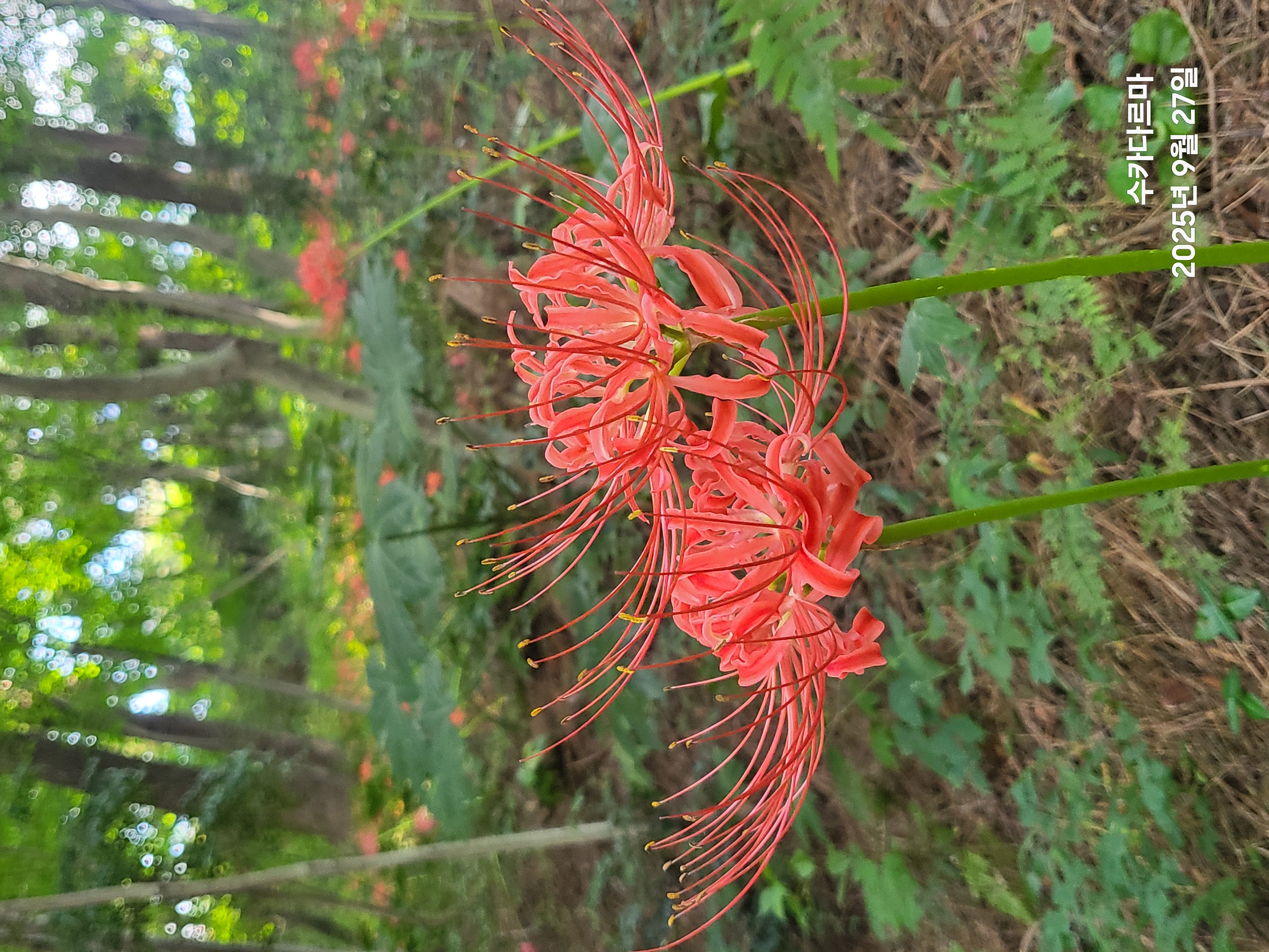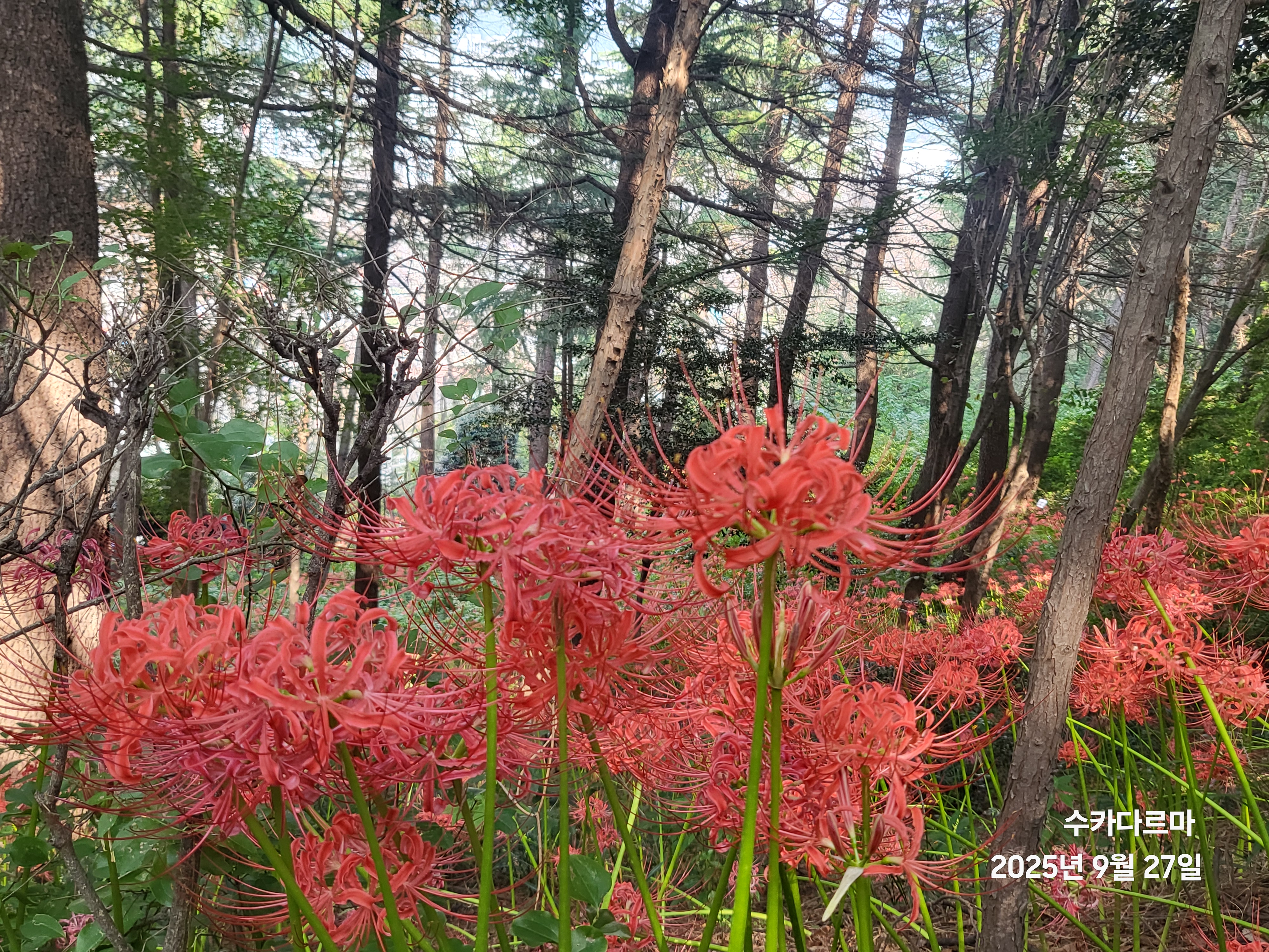 산호동 용마고등학교를 뒤로 둘러오르면 용마산 산마루에 쉽게 이른다. 산 길 곳곳이 붉게 단장을 한 듯 꽃무릇이 자태를 뽐내고 있다.